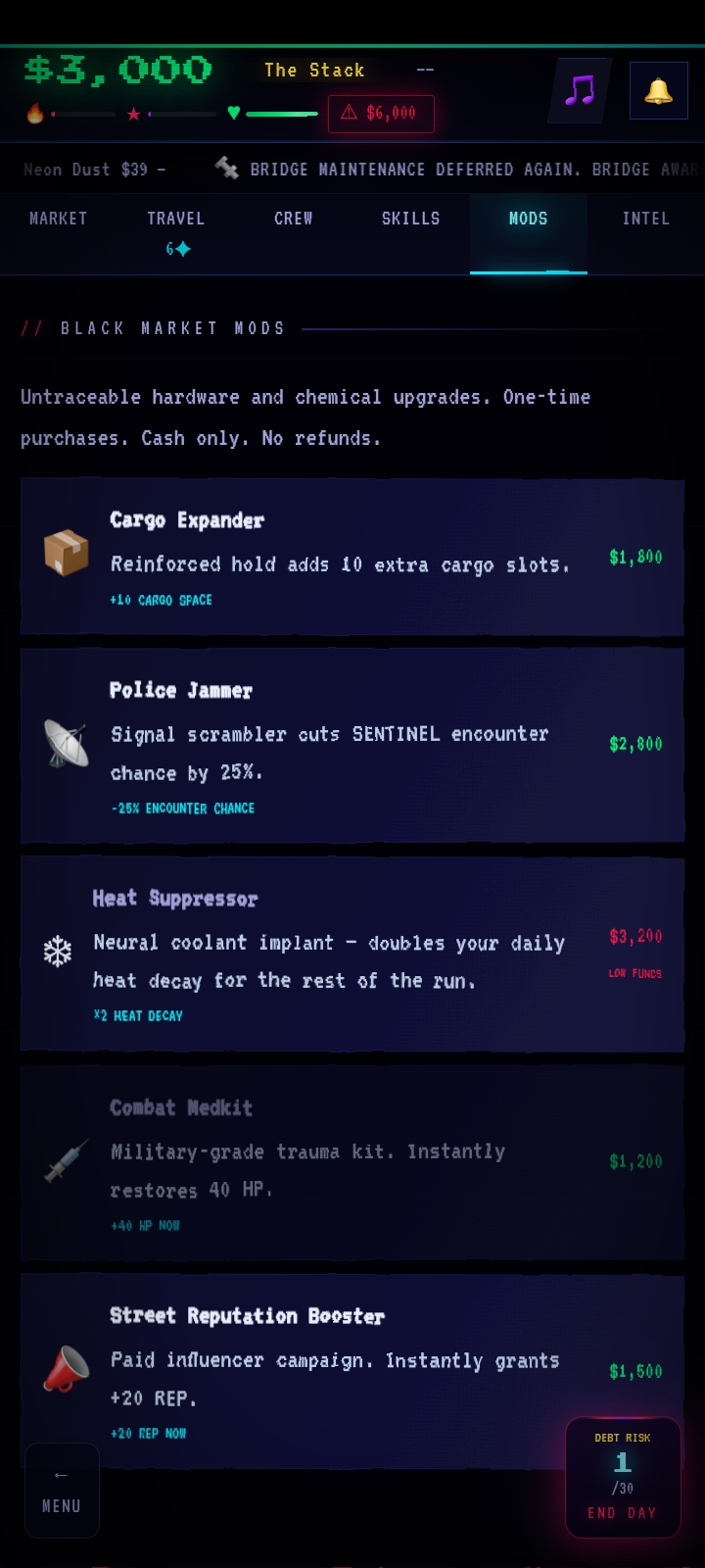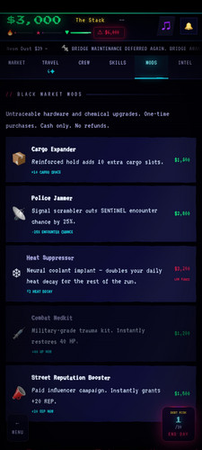 What a nice game! I like it in terms of acid-looking interface and cool music! I also like the idea and overall game mechanics. An interface is a bit buggy when you increment your debt payment. Firstly, I thought that the heat was a killing mechanism, and the police dunks me wherever I go. In fact, I made two or three speculations on the stock, and completely paid my debt in 4-5 days. After my synciate achieved 50k+ in annual revenue, the heat mechanic, my stock operations quality, and the police encounters stopped being a thing.