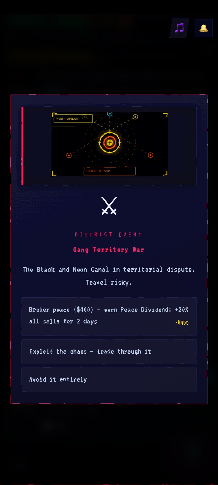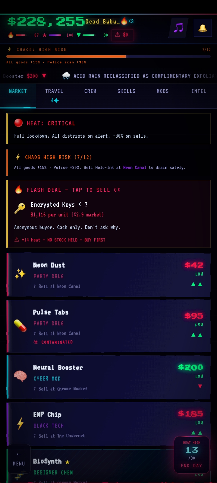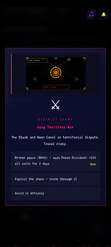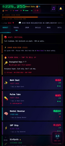 Neon Syndicate is a cyberpunk street-trading game where you buy low, sell high, and outmaneuver the Sentinel across neon-soaked districts. Every run is different. Every deal is a risk.